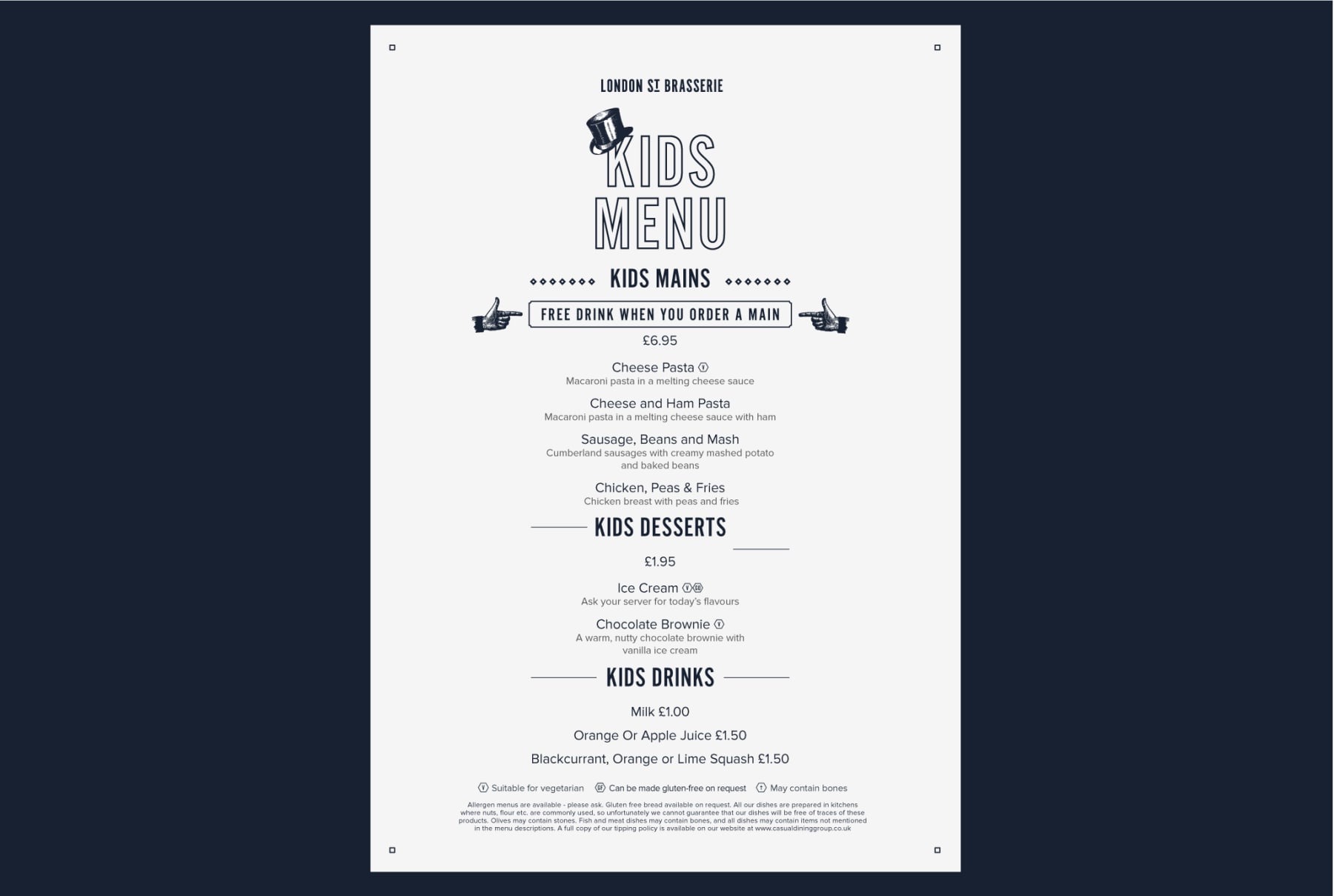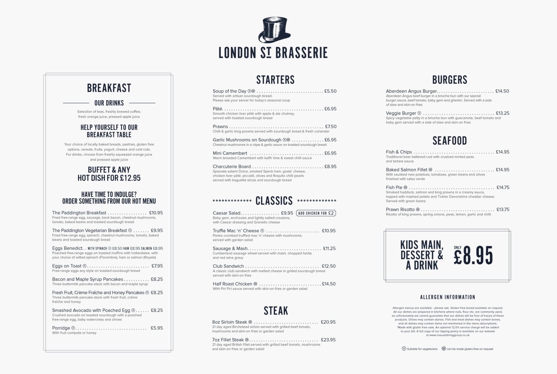 London St Brasserie is a trendy restaurant in London Paddington with a friendly atmosphere and great value. Situated close to Paddington Station this restaurant is a popular destination with tourists and locals alike. A quirky new brand identity and menu was required to further enhance the charm and character of this popular restaurant.